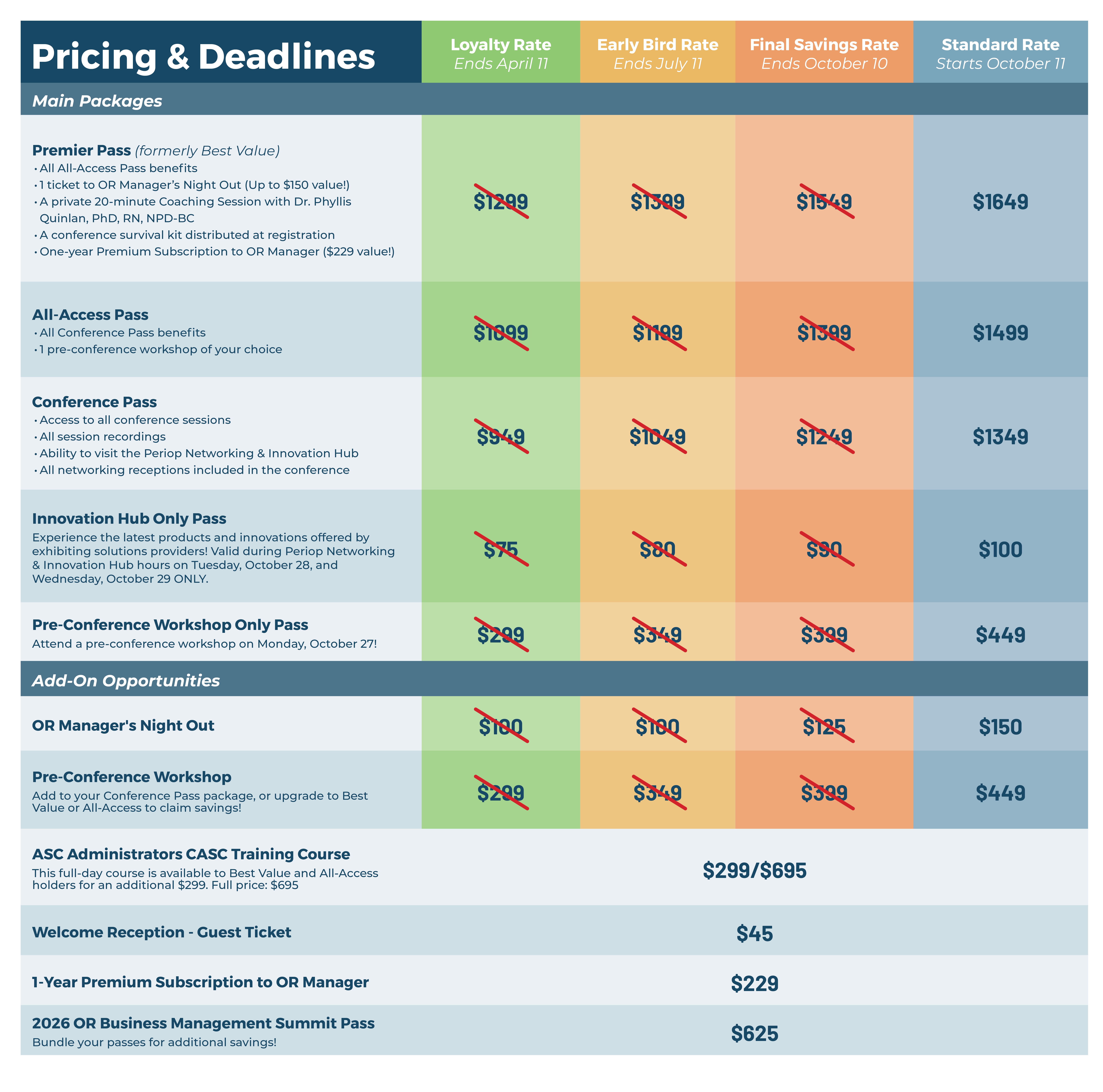 Learn more about our conference pass options below! Our passes offer a multitude of value to you as an attendee and allow you to meet with hundreds of the brightest minds in the perioperative industry. Premier (formerly Best Value), All-Access and Conference Passes grant access to all sessions & session recordings delivered post-conference!